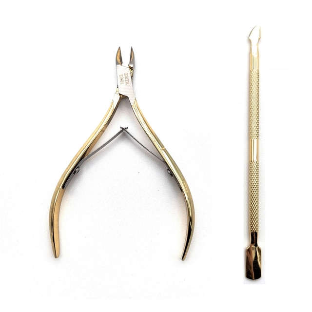 Eleva tu arte de manicura con nuestro exclusivo Kit Repujador y Alicate Corta Cutículas color dorado.