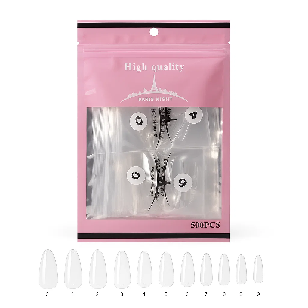 Tips Soft Gel Paris Night x500 – forma almendra. Flexibles, transparentes y de ajuste perfecto para uñas profesionales 💅